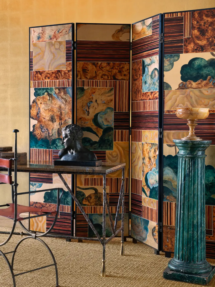 • Concepted as a stunning epitome of artisanal craftsmanship, pairing the elegance of French Art Deco marquetry with the refined tradition of Japanese Byobu screens, ‘Marquetrie Lotus’ is a faceted composition where sharp geometric forms intertwine to reveal glimpses of delicate lotus leaves - the symbols of purity and rebirth amidst the rich textures of burl, tiger wood, and zebrano: evoking wood panelling – an oft-used element within Art Deco interiors.