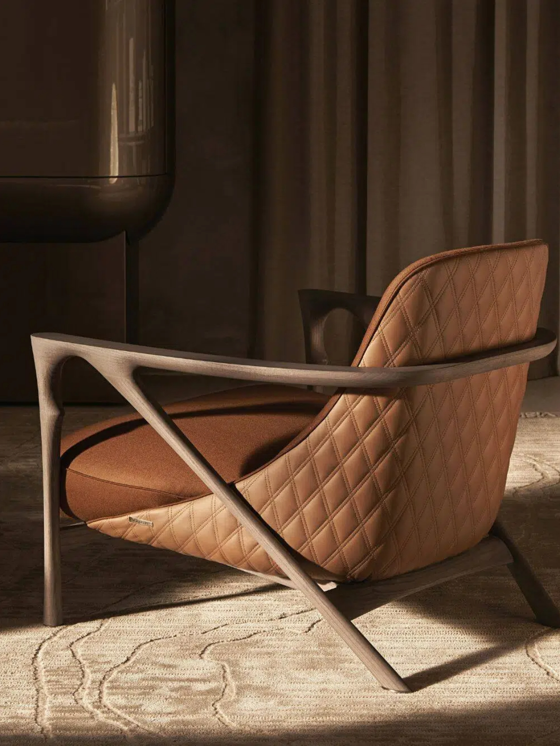 Lounge armchair with an exposed, sculpted frame in solid ash wood, defined by a sculptural weave that seamlessly integrates armrests and legs in a continuous gesture. The padded shell, in variable-density polyurethane, is upholstered in leather or fabric, with raised piping and a diamond-quilted backrest design. A refined yet essential silhouette, enhanced by artisanal finishes and rich material details.