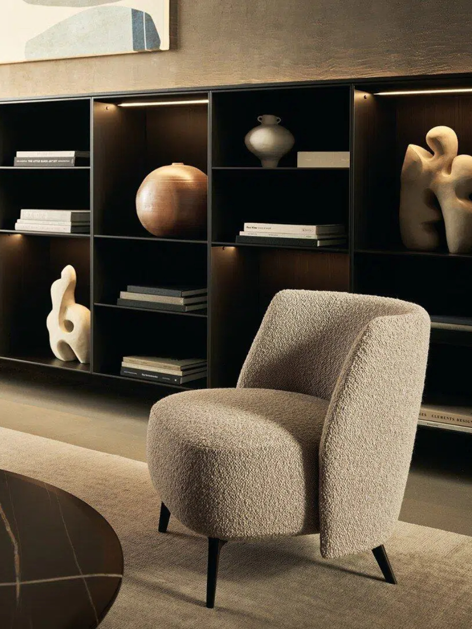 The small armchair completes Flavino Capriotti's Sunday collection. Elegant and comfortable, the armchair offers a full and pleasant seating experience, and its wraparound backrest can also be converted into armrests, helping you to relax and unwind, making it especially suitable for conversation.