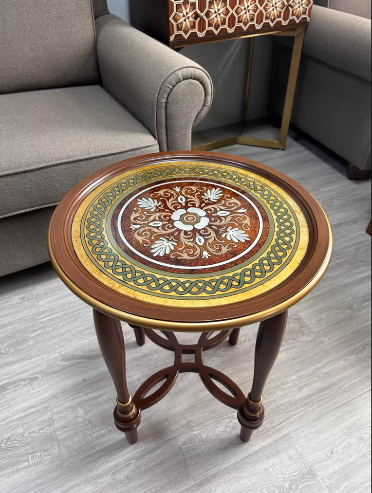 • Ornate Tabletop Detailing: The circular tabletop showcases intricate handcrafted inlay (or decorative artwork) in warm gold and neutral hues, adorned with floral or scroll motifs that evoke old-world charm. A polished edge adds a refined finishing touch.