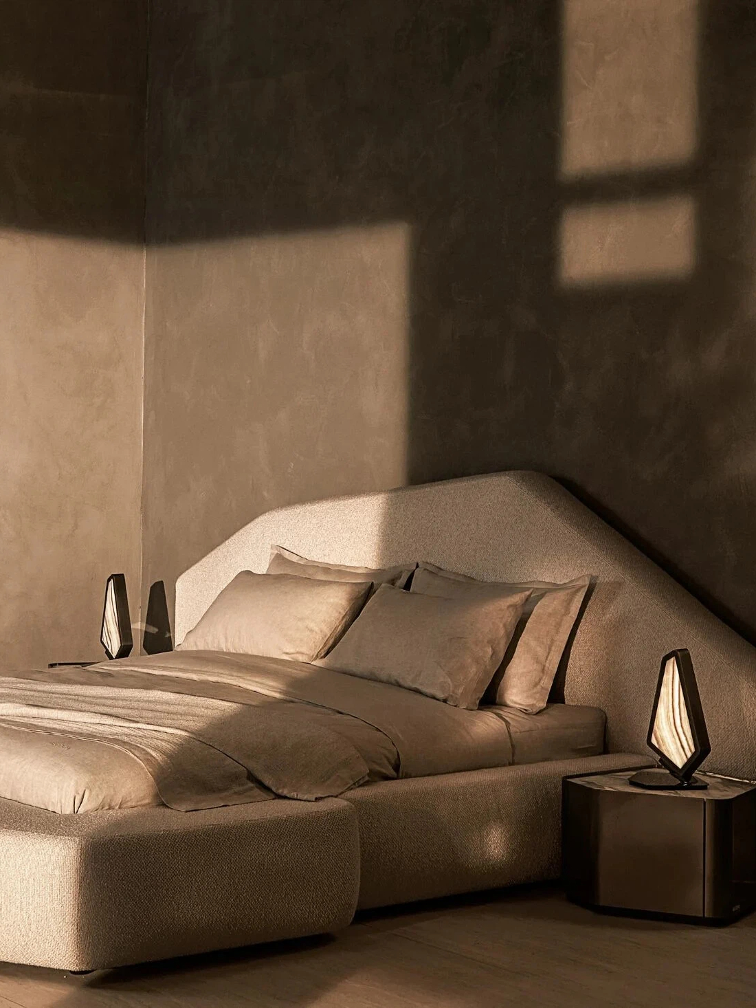 Upholstered bed in fabric or leather, with an asymmetrical headboard defined by a polygonal geometry and fully upholstered with ergonomic curvature. The internal structure in multilayer and solid fir wood is padded with multi-density polyurethane. The bed frame can be paired with a matching pouf upon request to emphasize its sculptural form.
