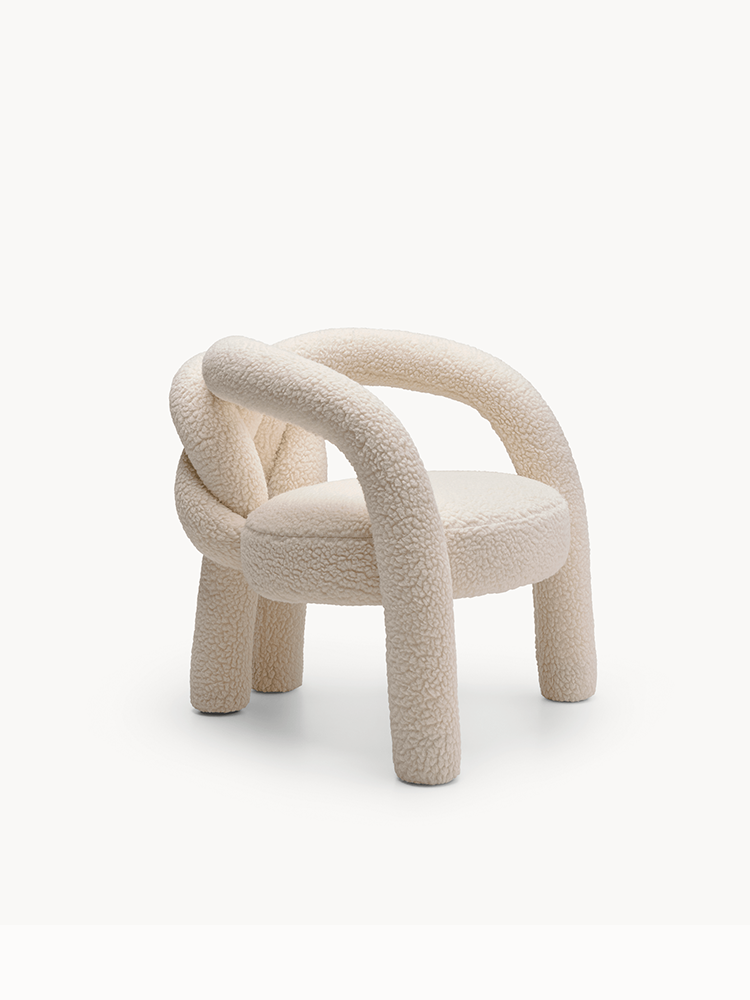 • Small armchair upholstered in stretch fabric, featuring a curved tubular metal frame fully padded with high-density expanded polyurethane and covered in fabric. The front and rear legs merge into the backrest, forming an interwoven structural element. The seat, supported by elastic webbing and padded with polyurethane, is also available in a Green version with metal spring suspension and plant-based materials.