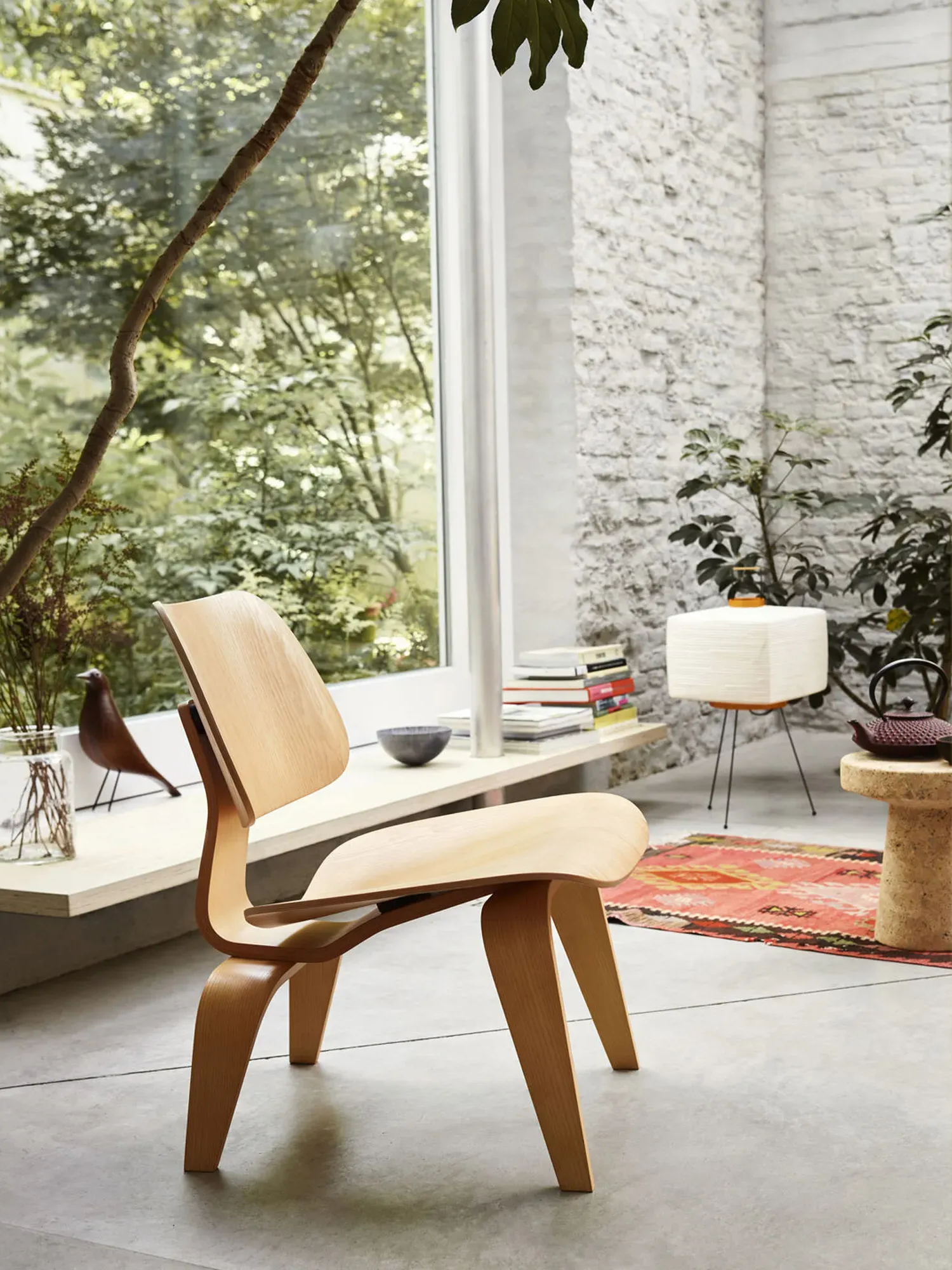The Plywood Group chairs are available in the versions DCW (Dining Chair Wood) and LCW (Lounge Chair Wood) with a wooden base or DCM (Dining Chair Metal) and LCM (Lounge Chair Metal) with a base in chrome-plated tubular steel.‎ The lounge chairs are available without upholstery or in a lightly upholstered version with a calfskin or leather cover.‎