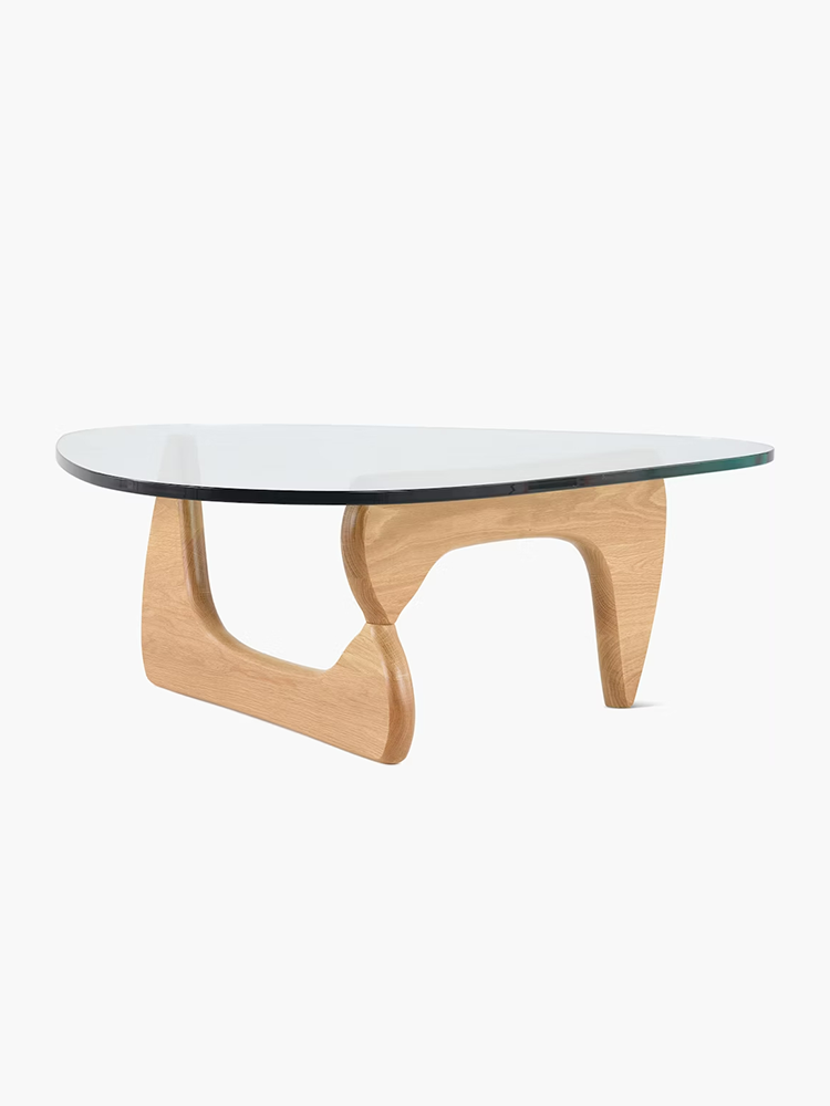 • Noguchi Coffee Table was designed by Isamu Noguchi in 1944. A 2-cm-thick glass top with rounded edges rests on two identical wooden parts symmetrically placed at right angles to each other. The base is made of wood and is available in black ash, maple, and walnut.Noguchi's work is artistically linked to abstract expressionism, and his design style came to have a great influence on 1950s design. His Coffee Table is today one of the most popular and iconic pieces from Vitra. Noguchi himself referred to the coffee table as the best piece of furniture he had ever designed.