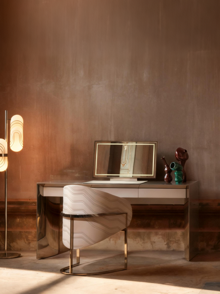 • Three-drawer vanity unit, with high-gloss lacquered wood shell and inner framing in curved stainless steel along the top and sides. Drawer fronts in leather or fabric pair with a coordinated writing pad and matte interior finish. The built-in mirror is steel-framed with LED backlit edge, completing a composition of pure lines and refined materials. Metal finishes customizable upon request.