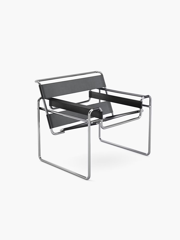• The iconic Wassily Chair is constructed of leather or canvas straps stretched across a tubular steel frame—originally inspired by the bends in a bicycle. It was the first chair of its kind in 1925, and it remains a celebrated symbol of modernism today.