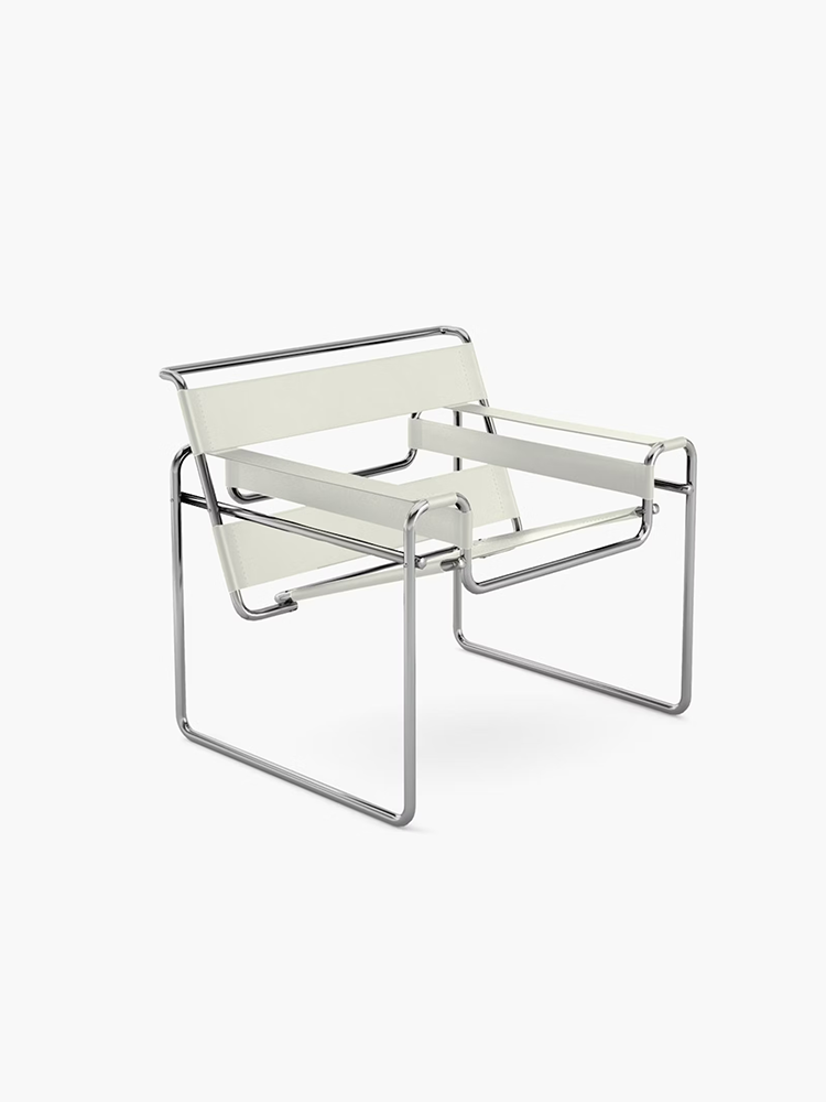 • The iconic Wassily Chair is constructed of leather or canvas straps stretched across a tubular steel frame—originally inspired by the bends in a bicycle. It was the first chair of its kind in 1925, and it remains a celebrated symbol of modernism today.